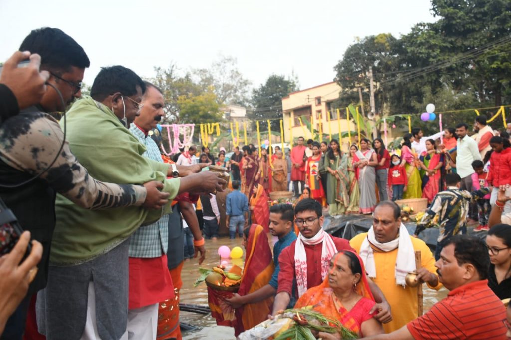 झारखंड सरकार की ओर से मंत्री रामेश्वर उरांव ने कृत्रिम तालाब में अर्घ्य अर्पित किया