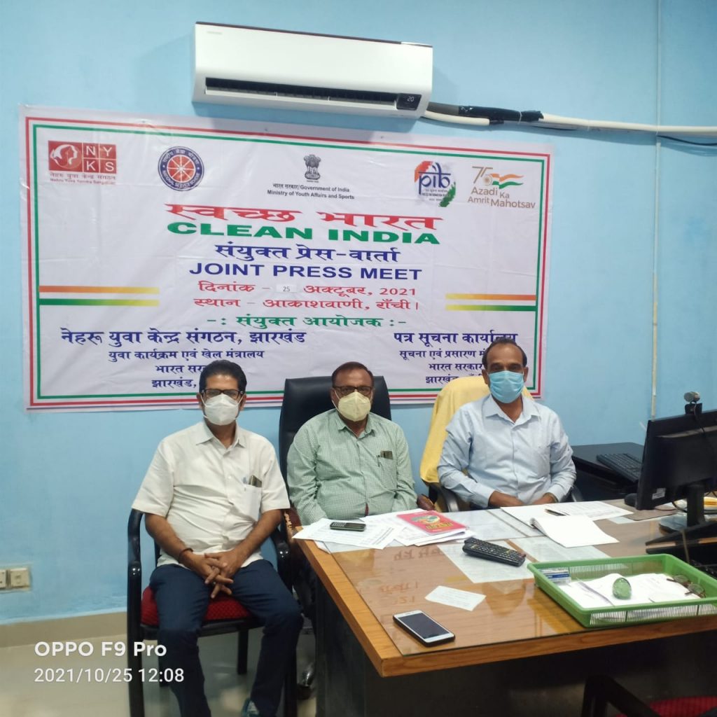 आज 25 अक्टूबर 2021 को पुनः राज्य निदेशक, नेहरू युवा केन्द्र संगठन, झारखण्ड, अपर महानिदेशक, पी आई बी, राज्य समन्वयक एन एस एस ने संयुक्त प्रेस वार्ता के दौरान यह जानकारी दिया कि नेहरू युवा केन्द्र संगठन, झारखण्ड के 22 जिलों के विभिन्न महत्वपूर्ण स्थलों पर अपने स्वयं सेवकों, युवाओं, सामाजिक कार्यकर्ताओं, जनप्रतिनिधियों, के साथ स्वच्छता अभियान दिनांक 01 अक्टूबर से लागातार संचालित करते हुए समय से पूर्ण लक्ष्य को हासिल किया। इस दौरान झारखण्ड के ऐतिहासिक स्थलों पर सम्मानित जनप्रतिनिधियों, लोक सभा सदस्य, विधानसभा सदस्य के साथ लोगो को जागरूक करने का काम किया गया।